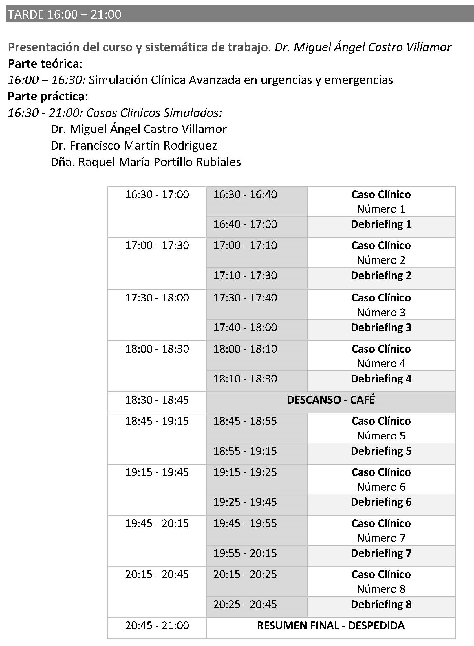 Durante la realización del curso los alumnos se enfrentarán a 8 situaciones clínicas urgentes/emergentes que deberán resolver en tiempo real (10 minutos). Tras la resolución de cada situación clínica se procederá a realizar un debriefing de la simulación (20 minutos).