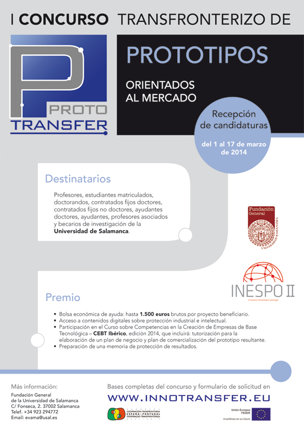 En el marco de la Red de Transferencia de Conocimiento Universidad-Empresa Región Centro de Portugal-Castilla y León, la FUNGE promueve la actividad PROTOTRANSFER, I Concurso Transfronterizo de Prototipos Orientados al Mercado.